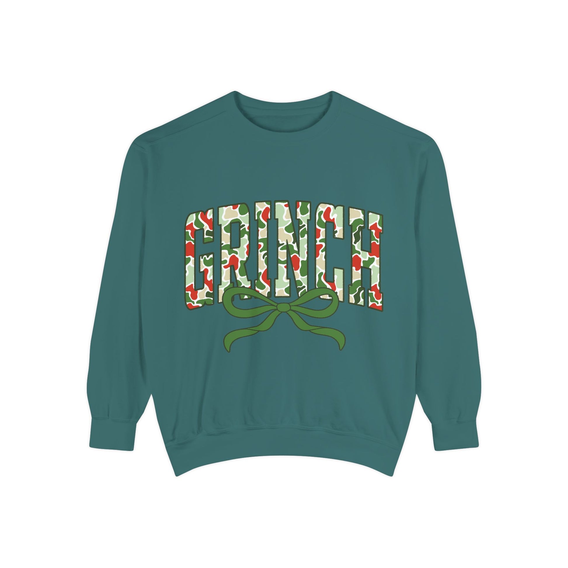 Grinch Holiday Sweatshirt — Green Camo 'GRINCH' Bow Pullover