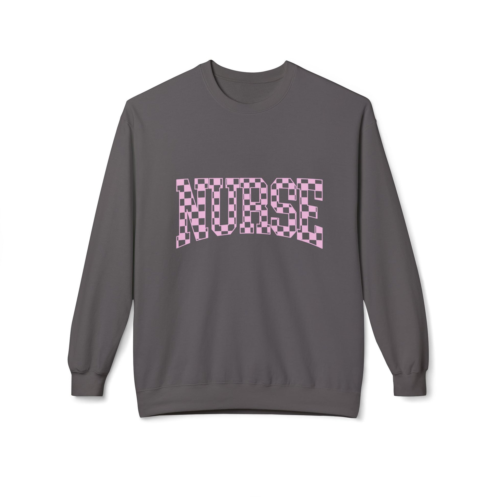 Soft, cozy, and quietly confident — this midweight crewneck wraps a caring professional in comfort while letting them wear their role with gentle style. The white sweatshirt features a soft pink checkerboard “NURSE” graphic across the chest, a nod to both playfulness and practicality. With dropped shoulders and a classic, slightly relaxed silhouette, it moves easily from early-shift rounds to late-night study sessions. The fabric feels substantial without being stiff, and the ribbed cuffs and hem hold shape through many wears. It sits naturally in a nurse’s daily rhythm: supportive, approachable, and quietly proud.